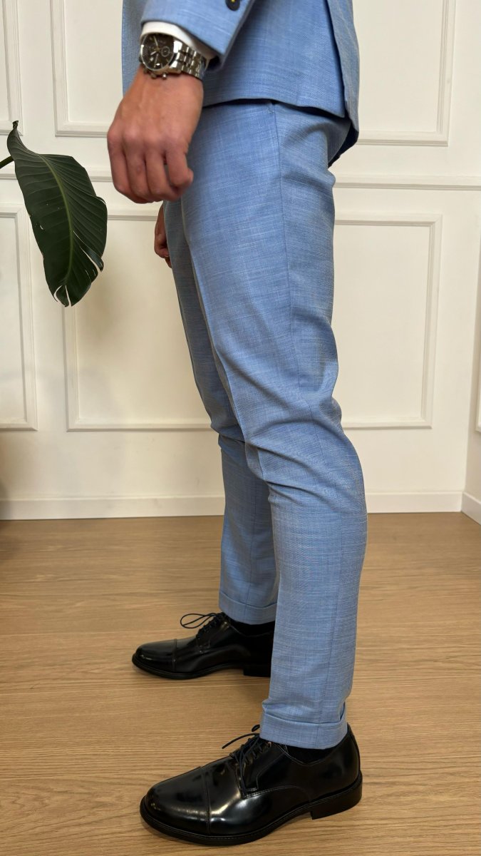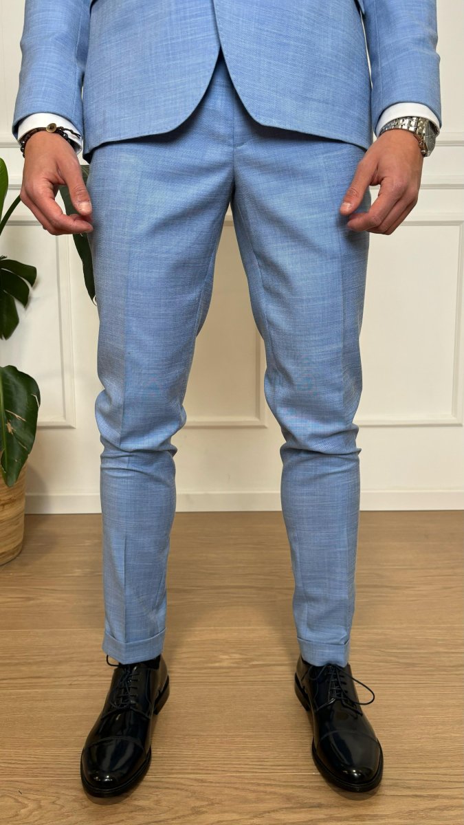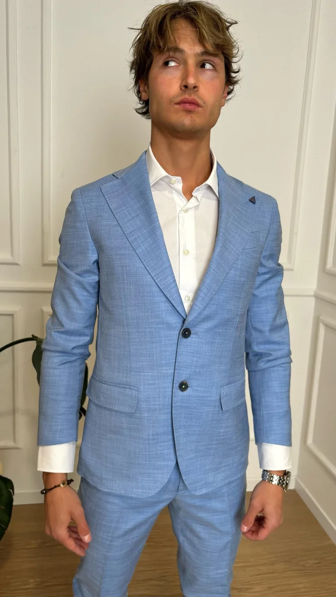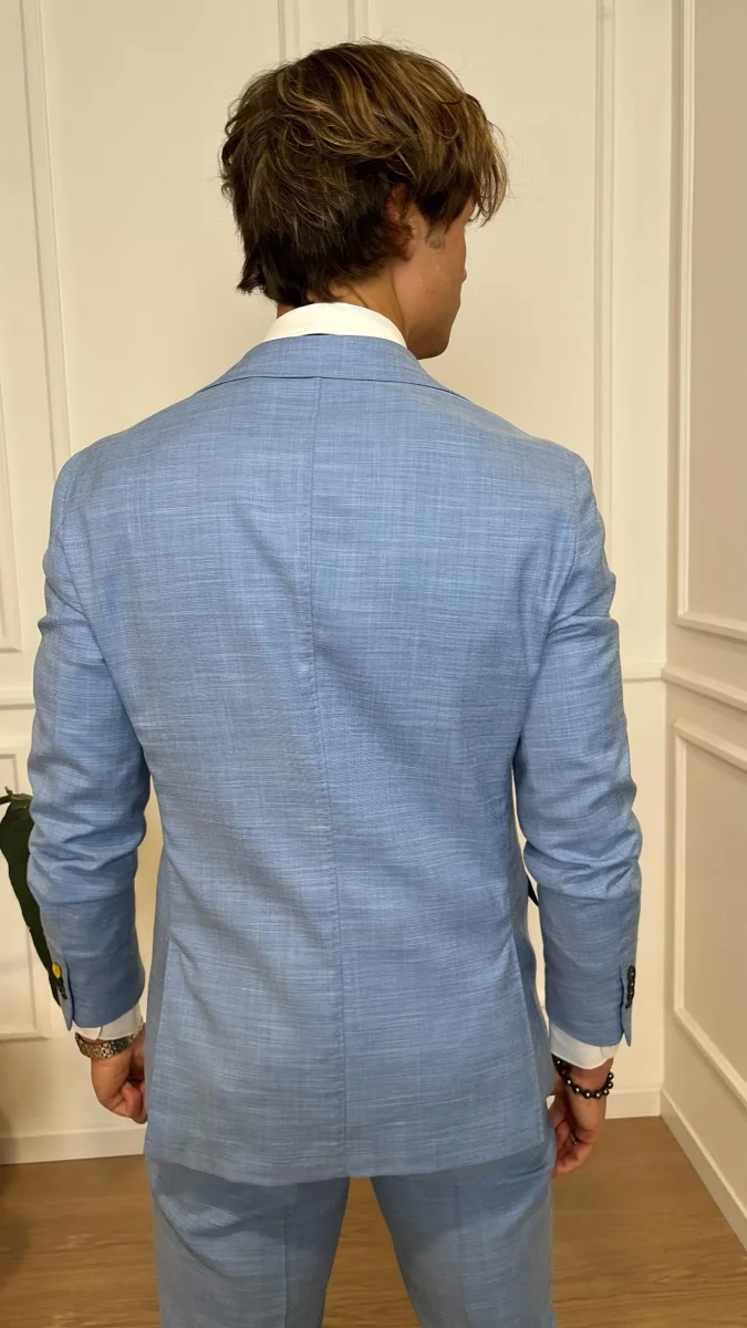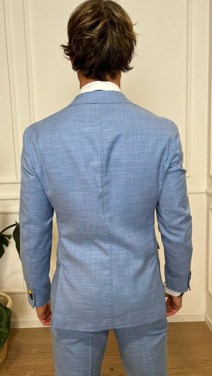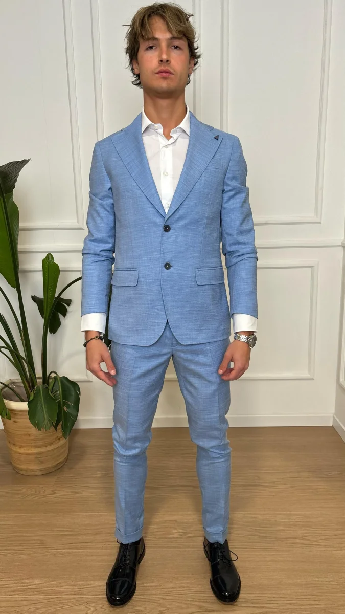 Abito Orazio G62AM 0025 in misto viscosa, modello drop8, giacca monopetto, doppio spacchetto laterale e taschino sul petto. Pantalone stretch con risvolto sul fondo.