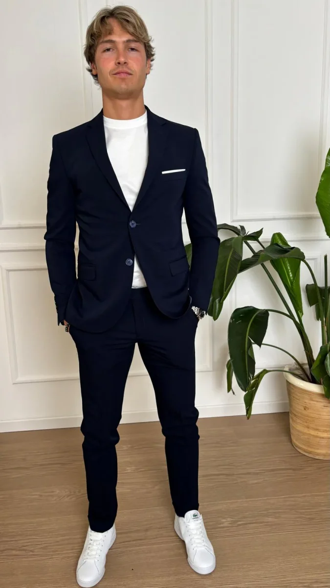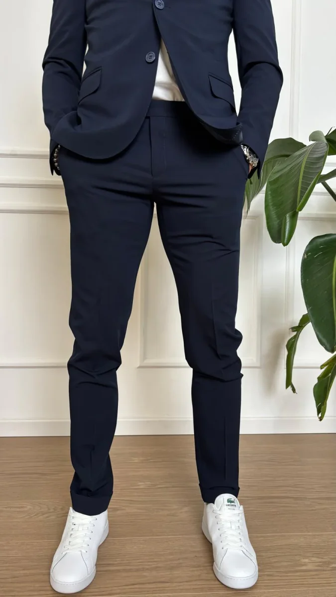 Abito slim stretch Turchetti KU555 blu, in tessuto leggero tinta unita, giacca monopetto, pantalone slim. Il modello รจ alto 1.80 e indossa la Tg. 50 COMPOSIZIONE: 100% POLIESTERE