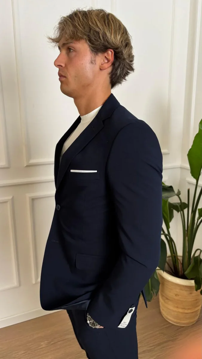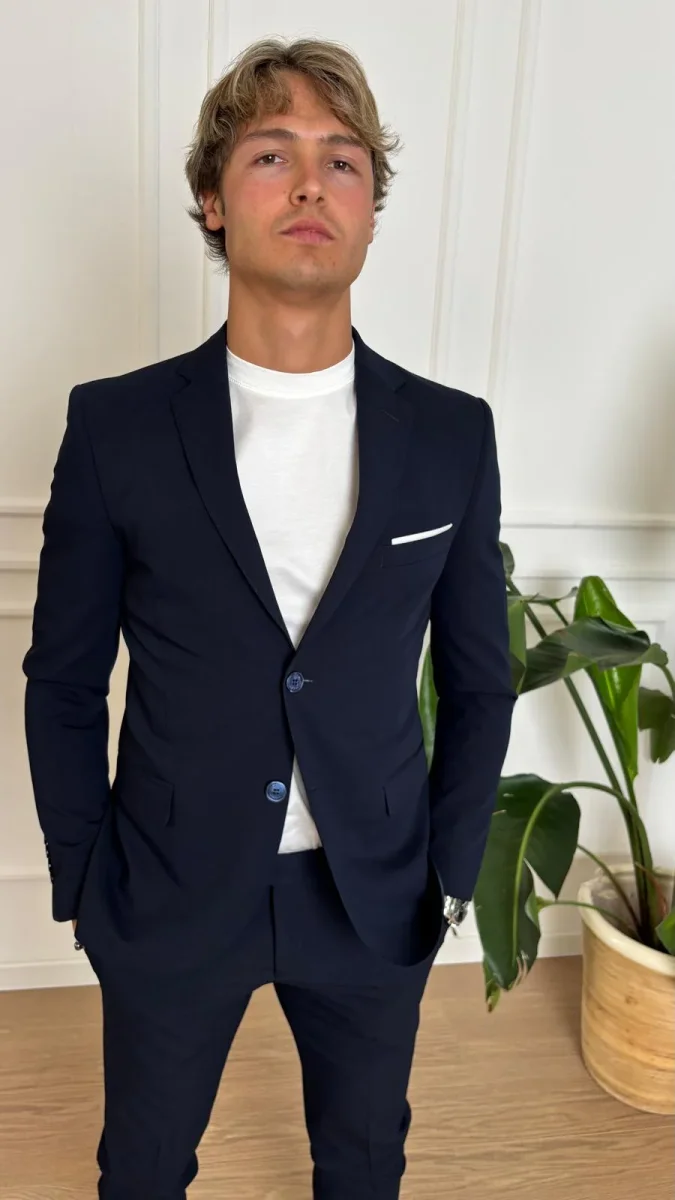 Abito slim stretch Turchetti KU555 blu, in tessuto leggero tinta unita, giacca monopetto, pantalone slim.