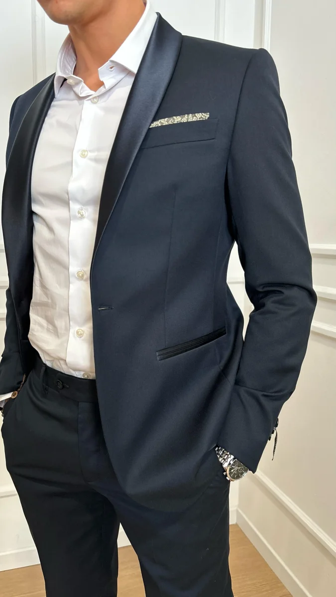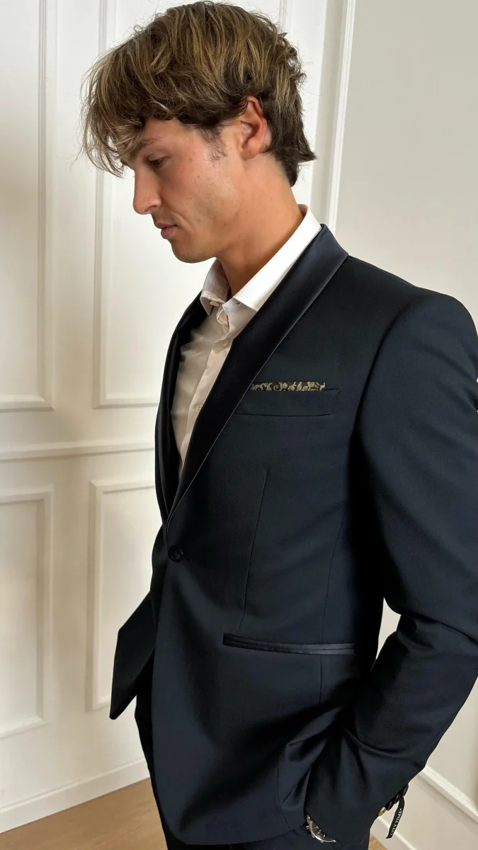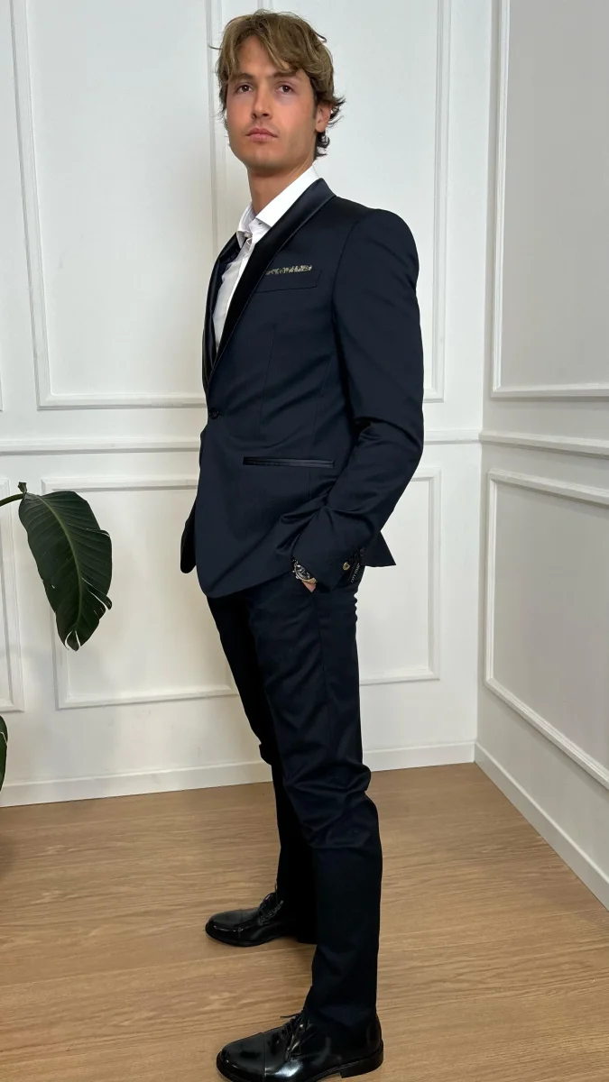 Abito smoking City Time 5128U 00020, giacca con revers arrotondato in raso, silhouette a un bottone, polsi con quattro bottoni decorativi, tre tasche interne, interamente foderate, pantaloni regolari slim, patta con cerniera e chiusura con gancetto allungata, tasche laterali all’americana, due tasche con bottone sul retro, senza orlo.