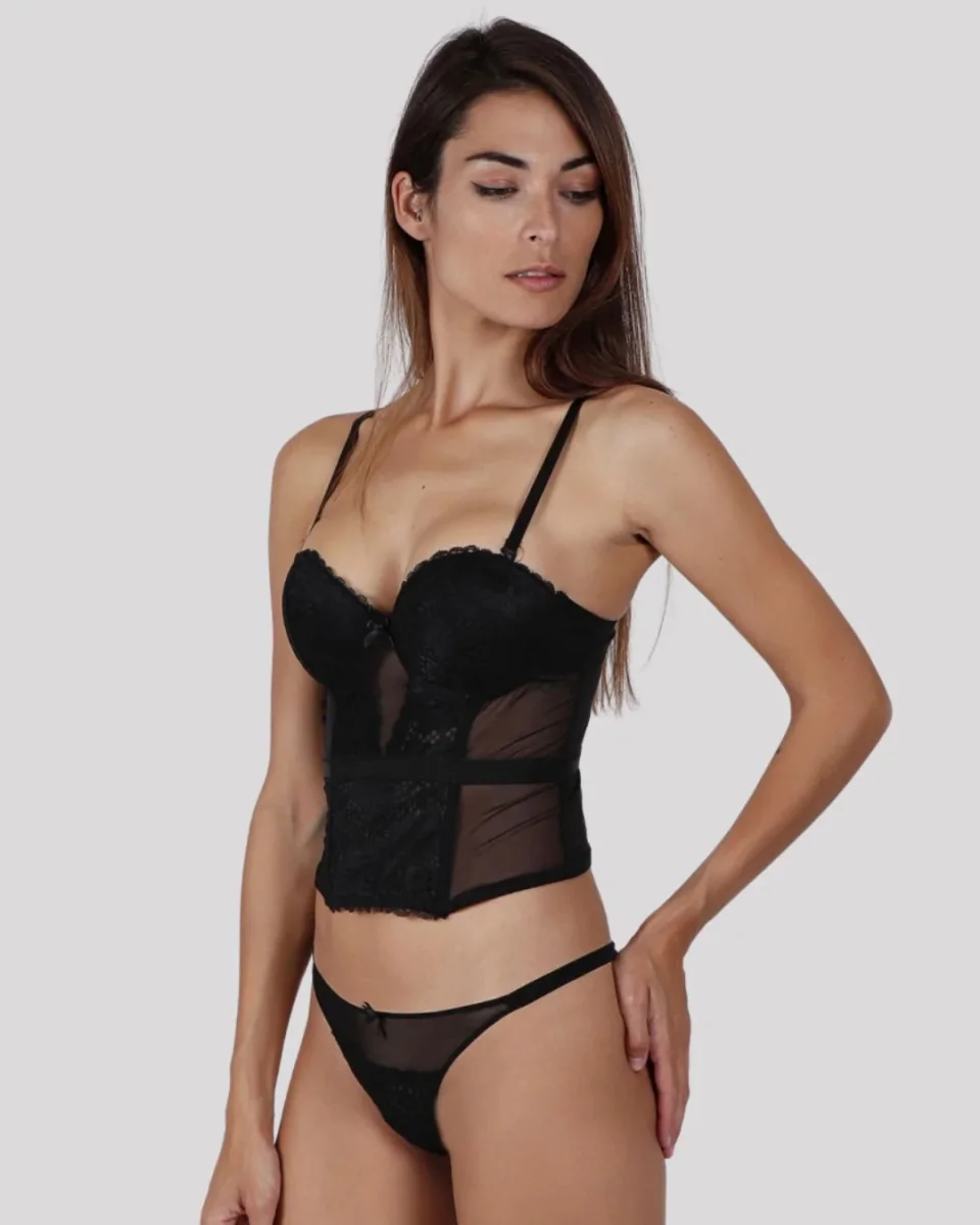 - Bustino Strutturato: Coppe preformate con ferretto per un ottimo sostegno e spalline sottili regolabili. Il corpetto lungo affina la figura.