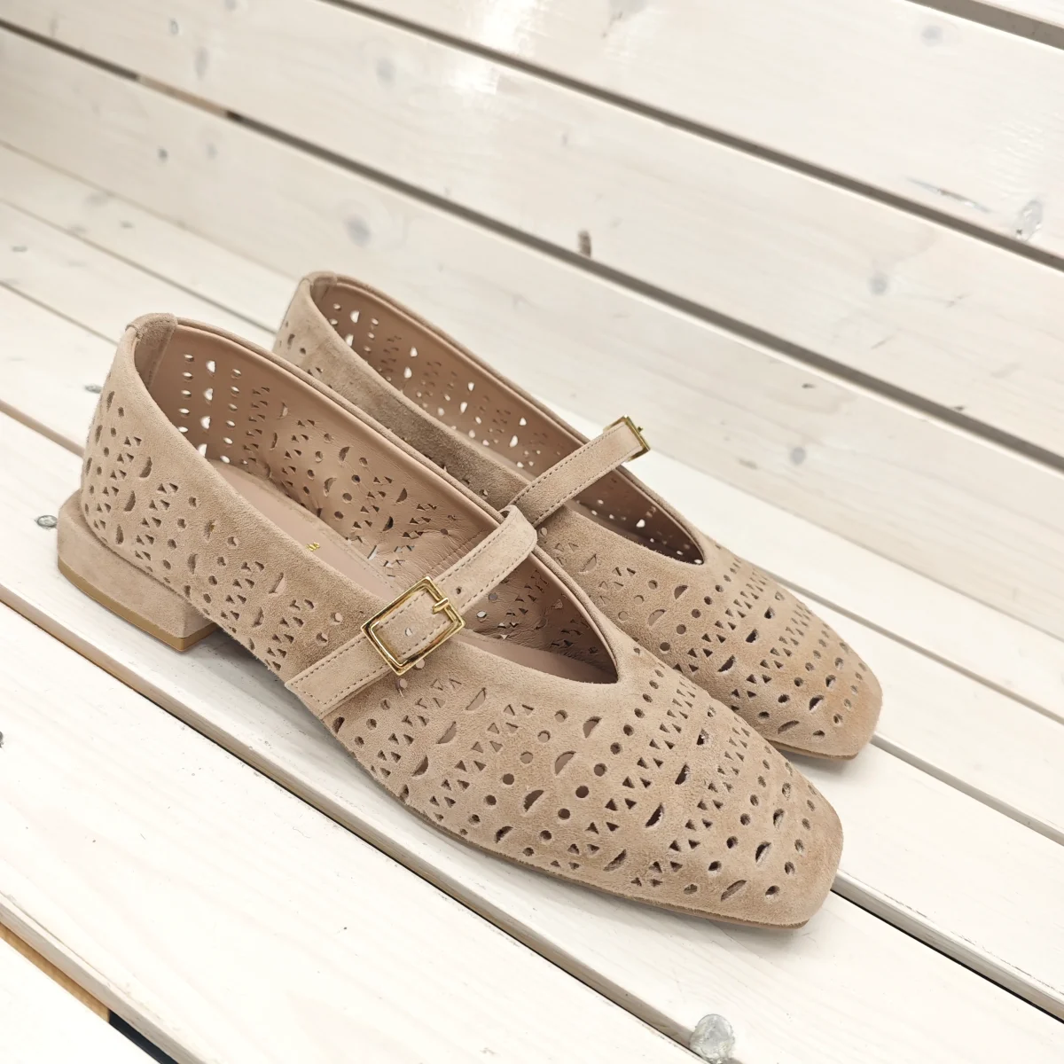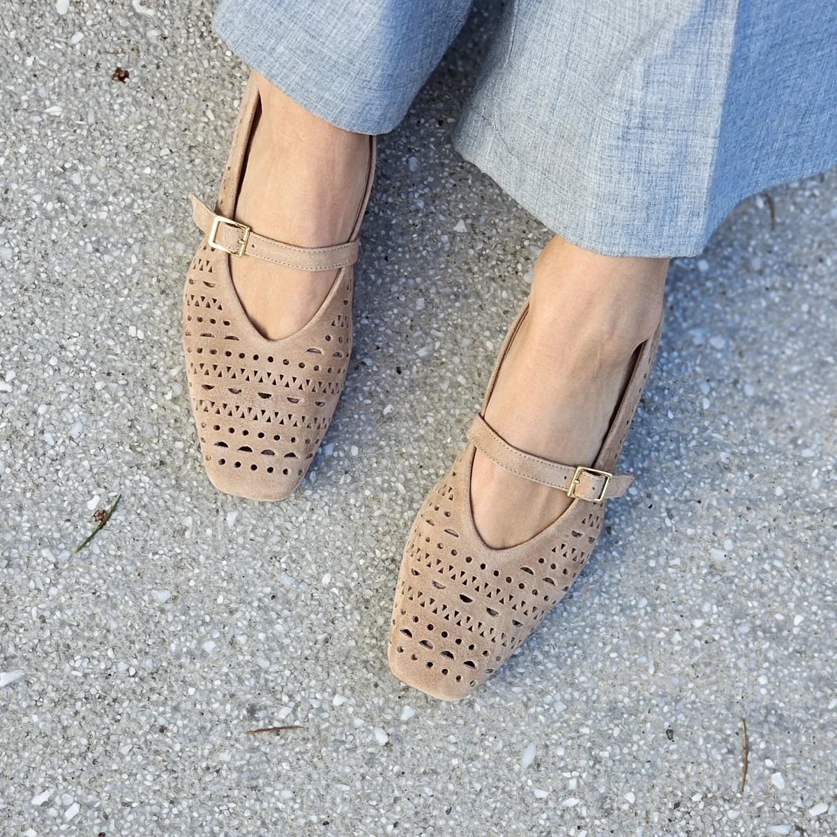 Ballerina a punta quadra in vera pelle laserata interna ed esterna senza conchiglia sul tallone e laccetto sul collo del piede, estremamente comoda, con cinturino sul collo del piede