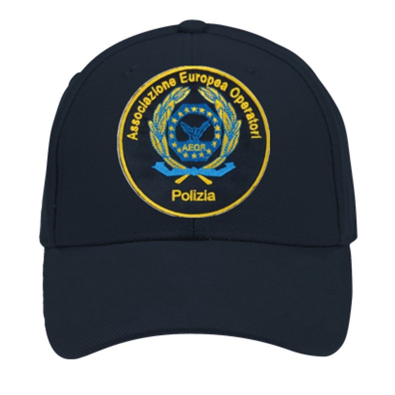 Cappello tipo baseball completo di patch AEOP tonda. Colore blu, taglia unica.