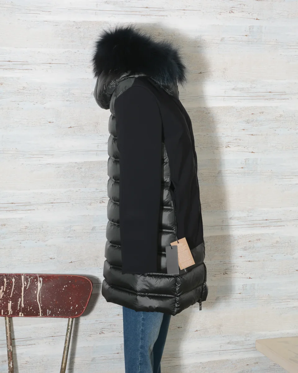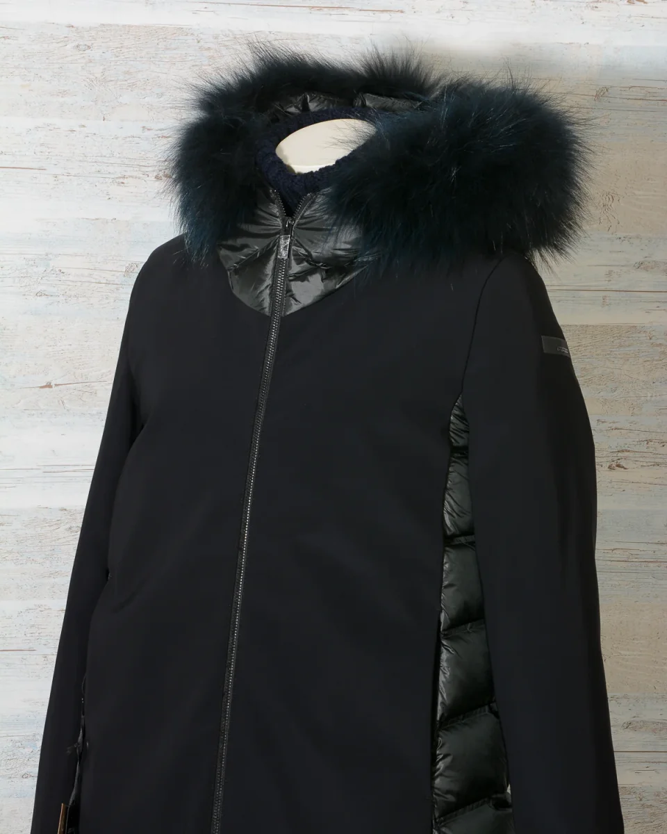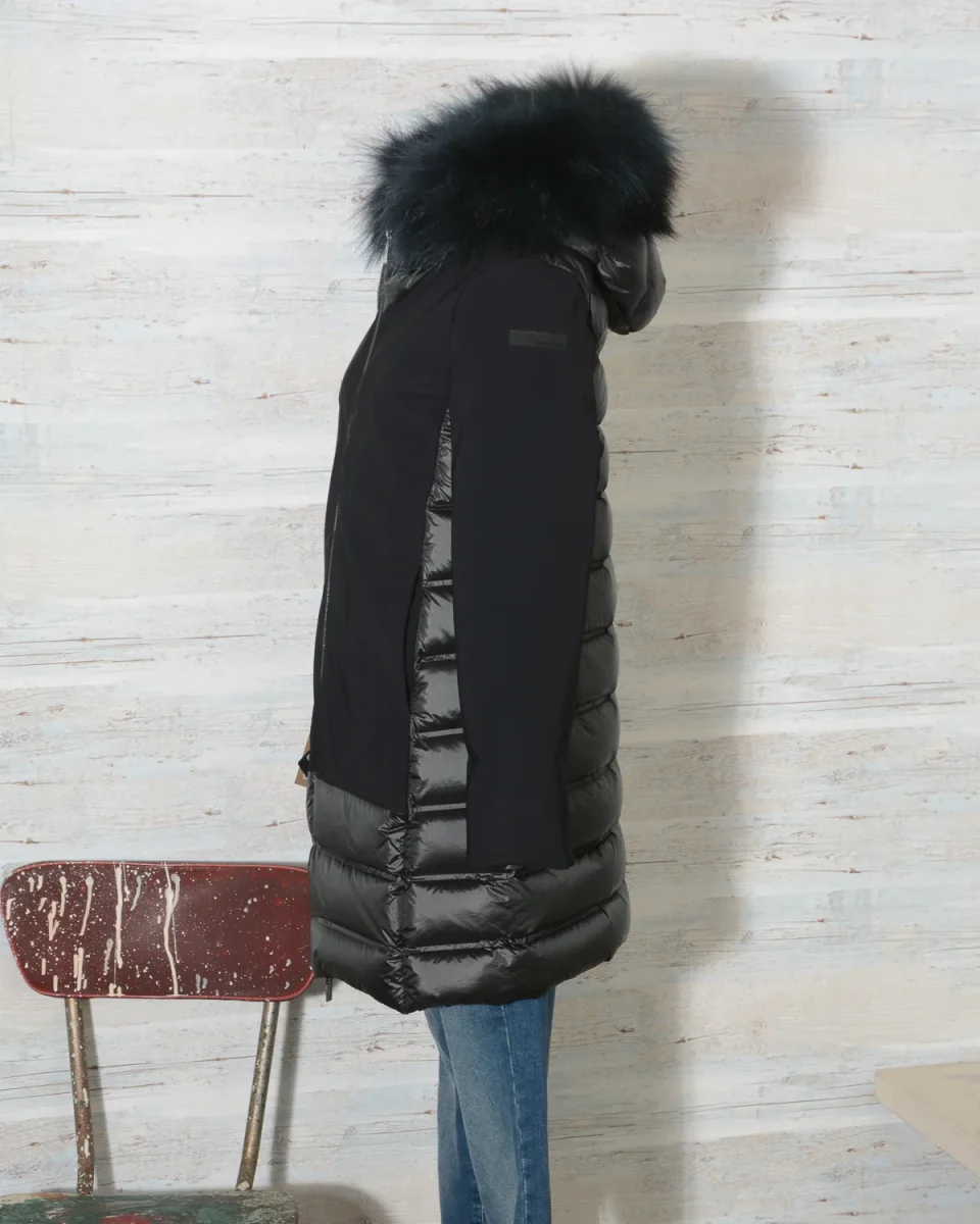 Parka Donna RRD – Roberto Ricci Designs in tessuto ibrido liscio e trapuntato con cappuccio fisso bordato di vera pelliccia in tinta rimovibile. Cerniera centrale. Tasche laterali con zip a scomparsa. Colore 10 Nero, Vestibilità regolare.