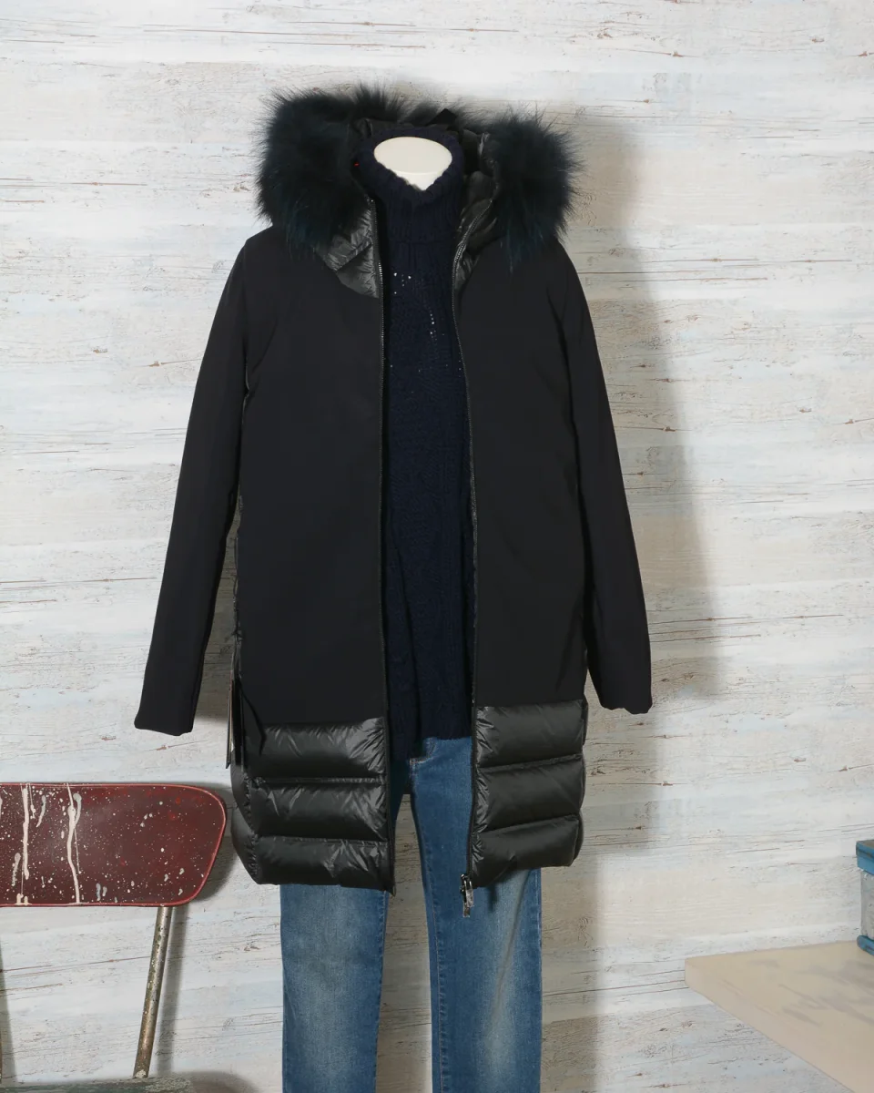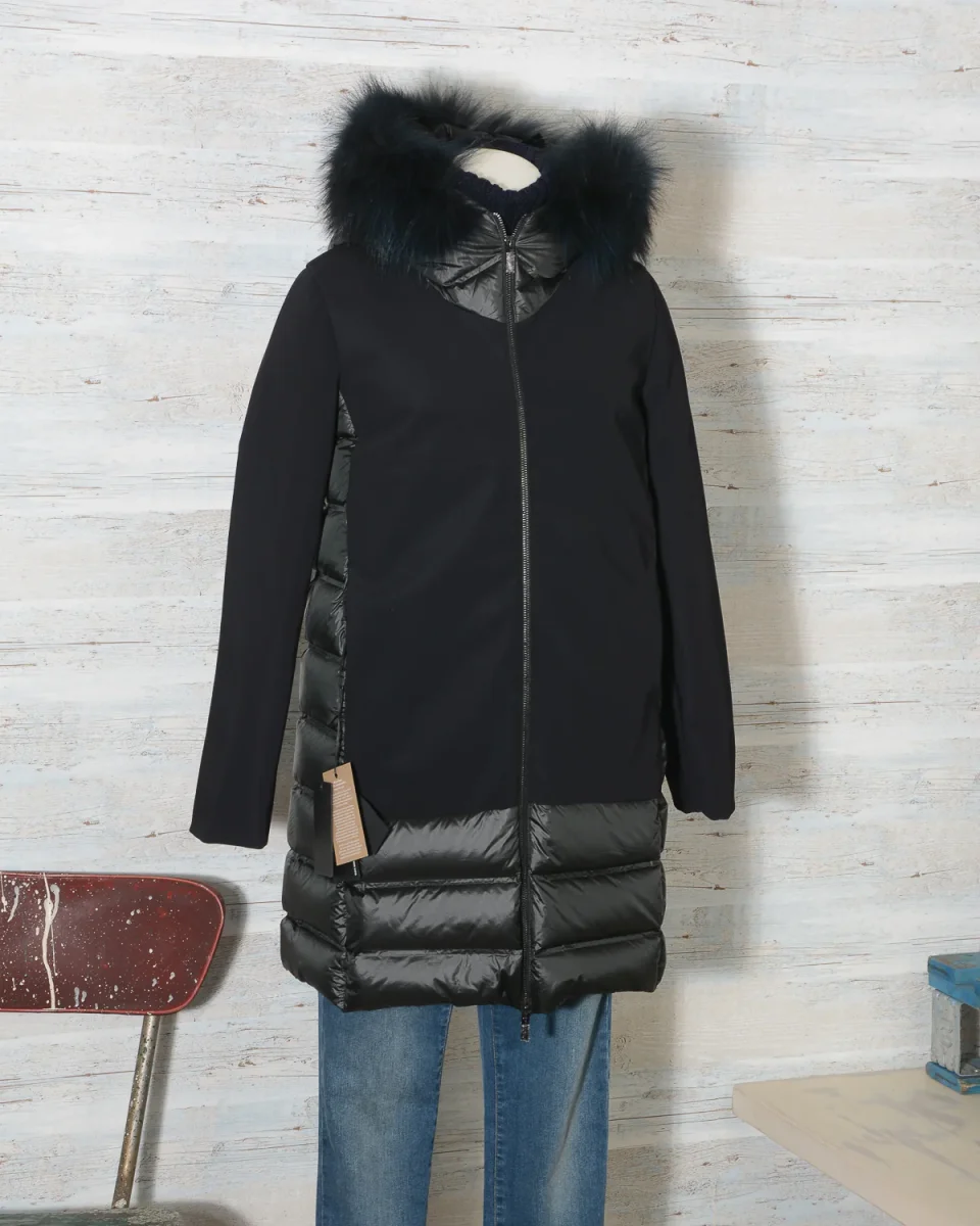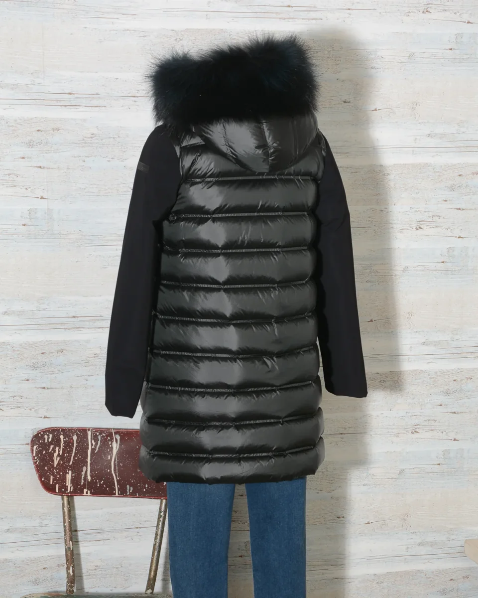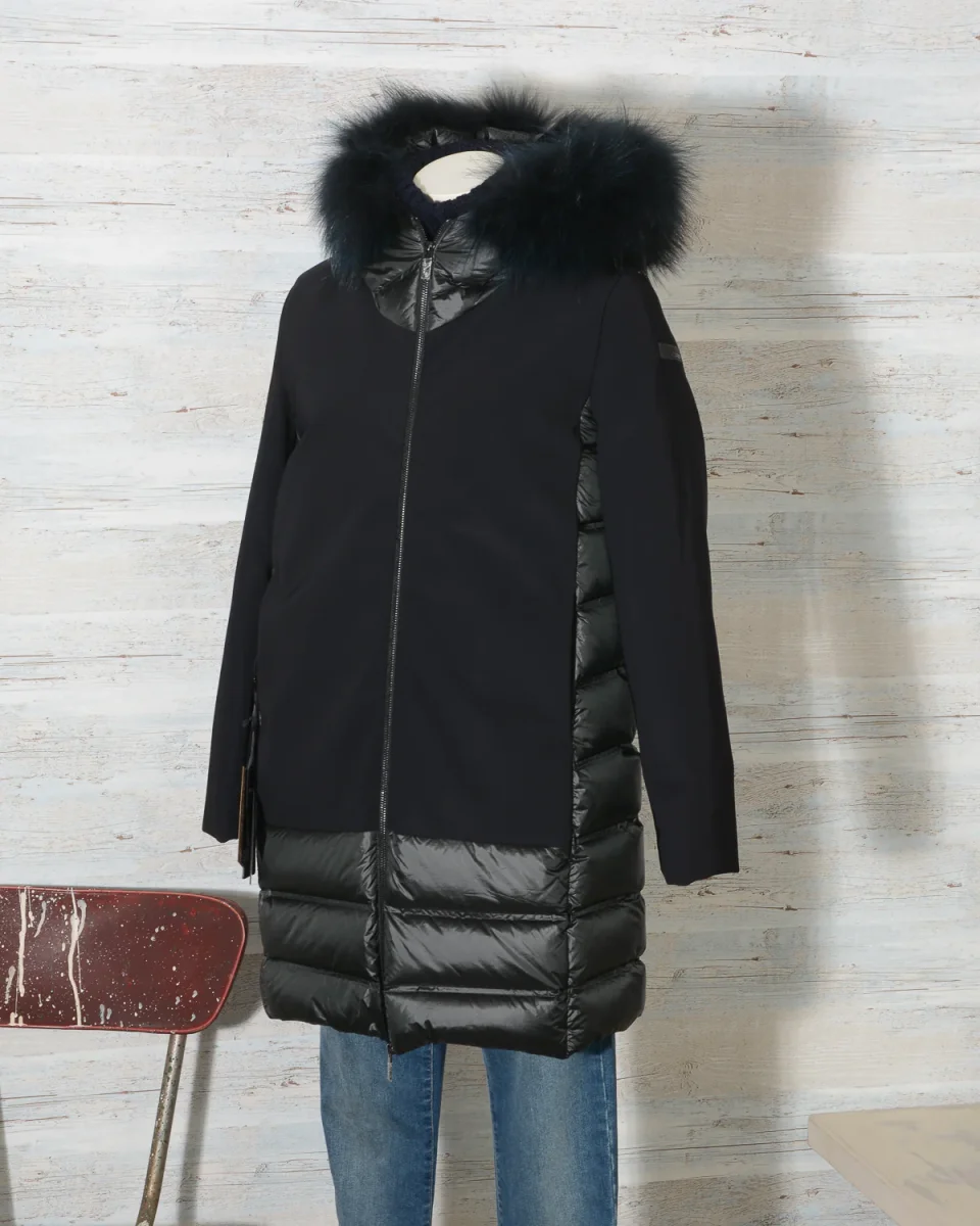 Parka Donna RRD – Roberto Ricci Designs in tessuto ibrido liscio e trapuntato con cappuccio fisso bordato di vera pelliccia in tinta rimovibile. Cerniera centrale. Tasche laterali con zip a scomparsa. Colore 10 Nero, Vestibilità regolare.