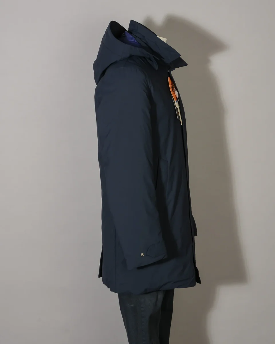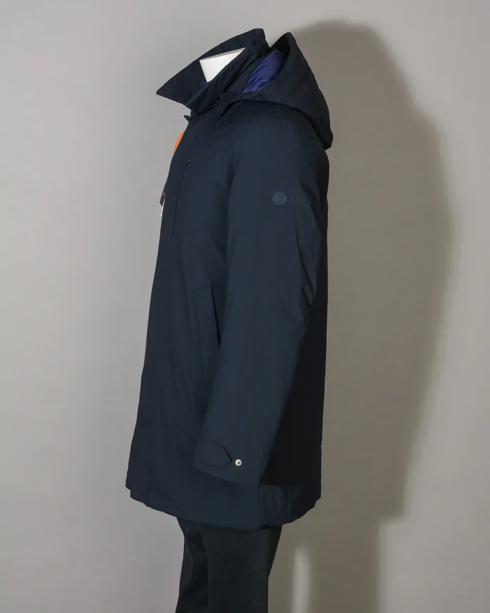 Chiusura centrale con cerniera e patta con bottoni. Collo camicia, due tasche corpo chiuse da pattina. Cappuccio removibile regolabile con coulisse e polsini con fibbia di regolazione con bottone. Tasca di servizio sul petto chiusa da cerniera. Logo tono su tono sulla spalla sinistra. Trapuntato e imbottito internamente, spacco centrale sul retro. Vestibilità regolare.