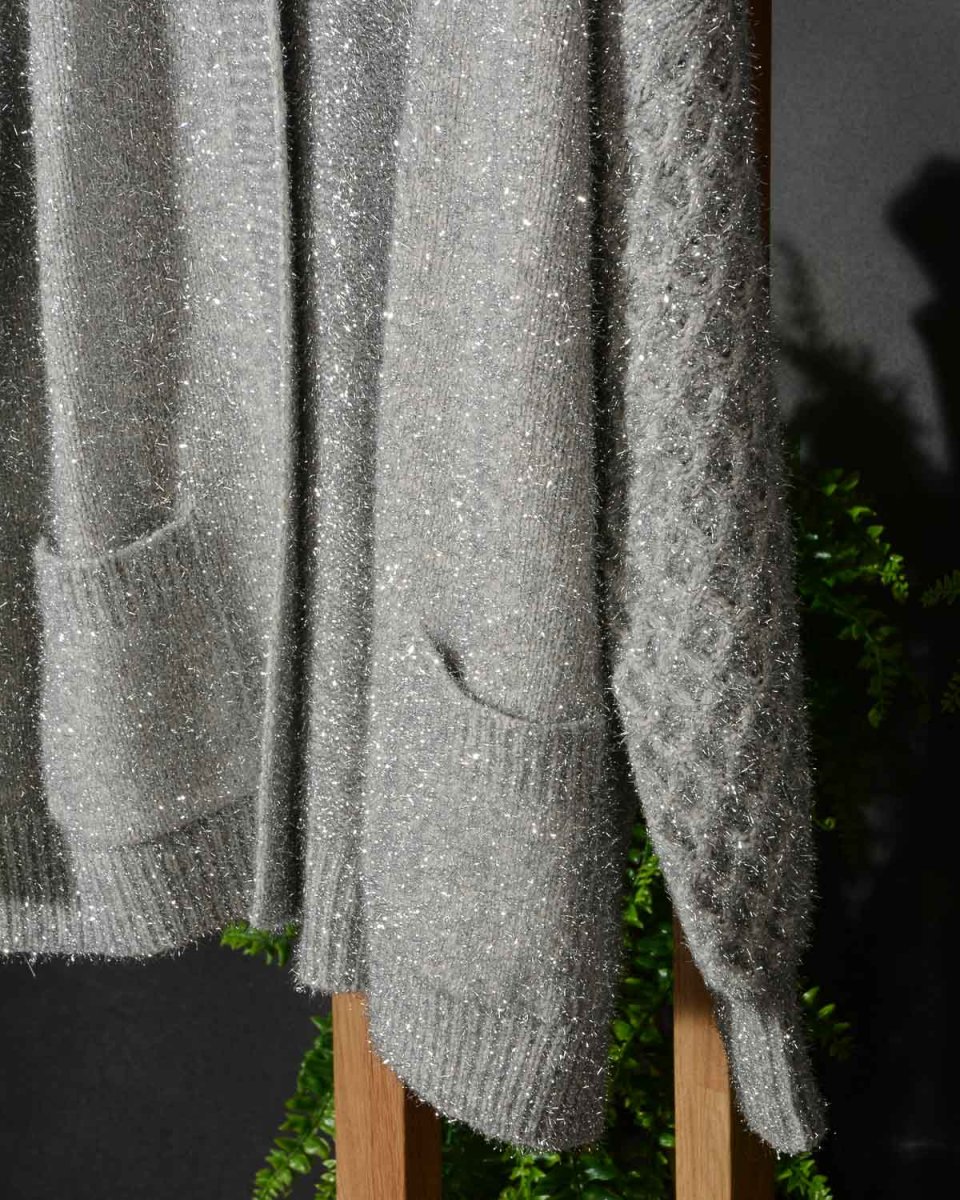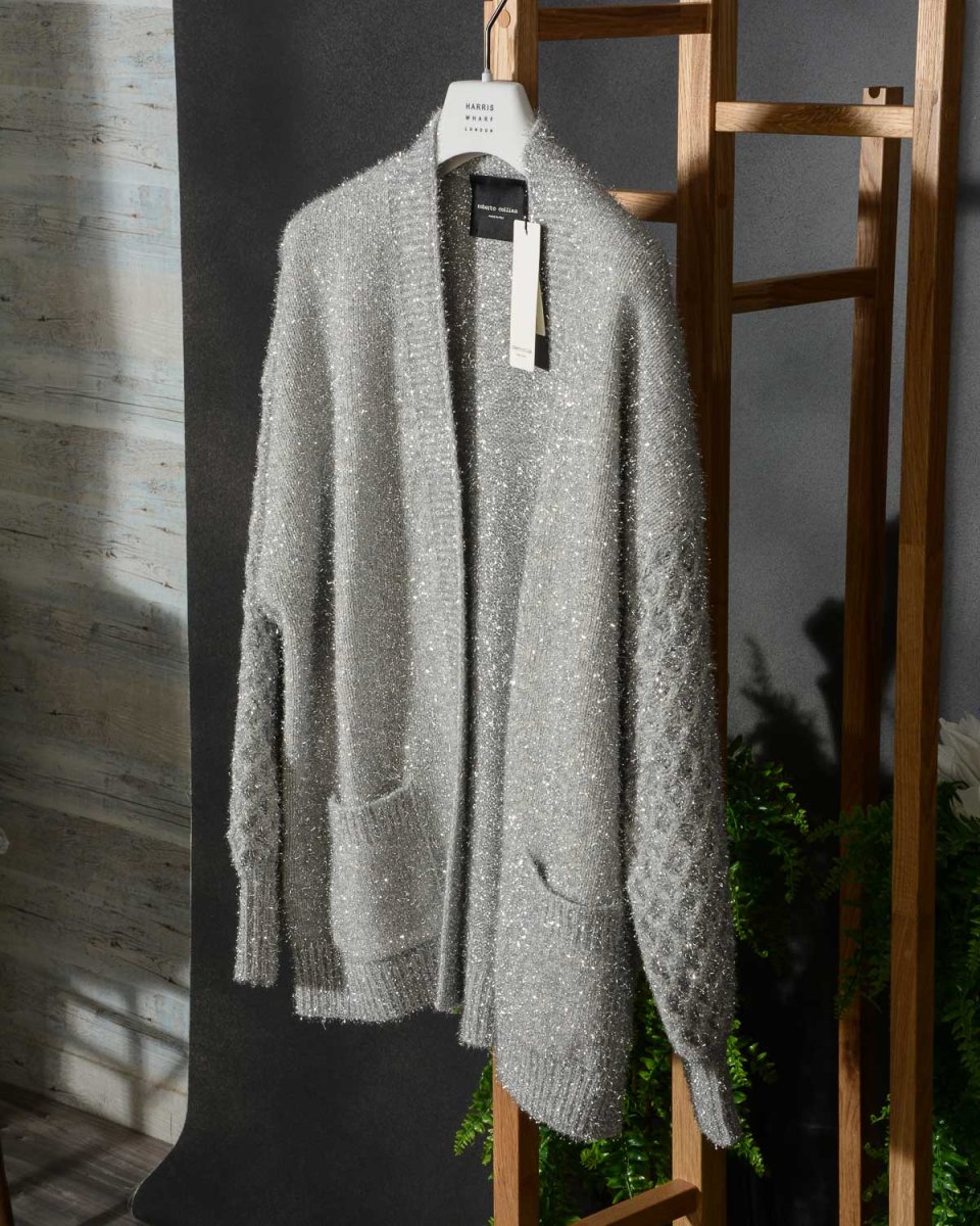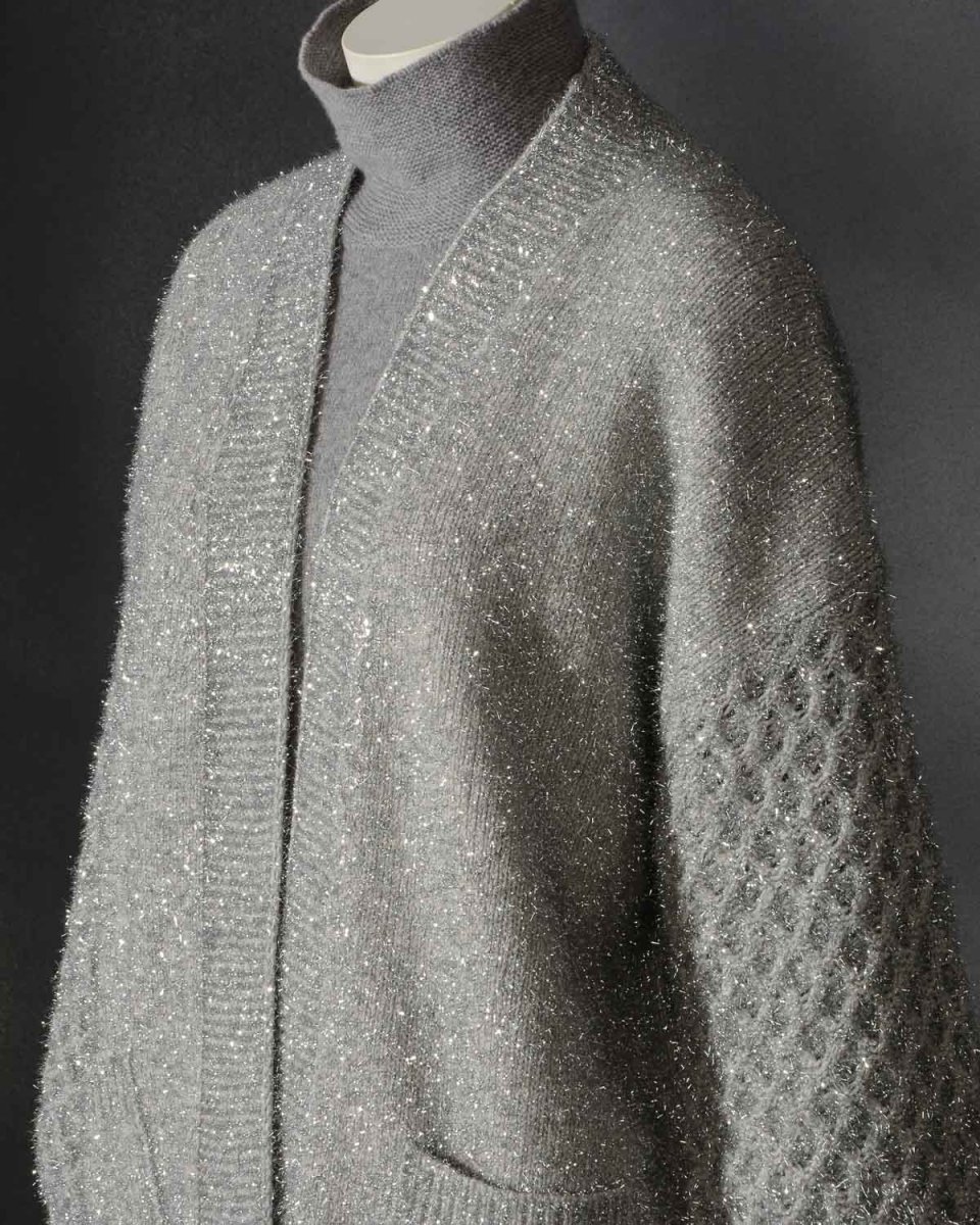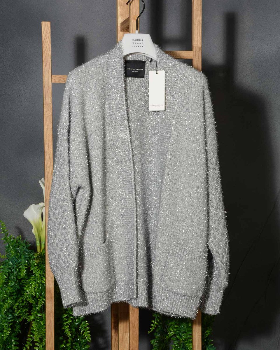 Shiny cardigan Roberto Collina D43210. Sorprendente nel design e nel materiale. Realizzato in cashmere e lana con un punto particolare in maglia, questo cardigan over è perfetto per farti splendere. Colore Argento con riflessi lucenti. Vestibilità comoda.