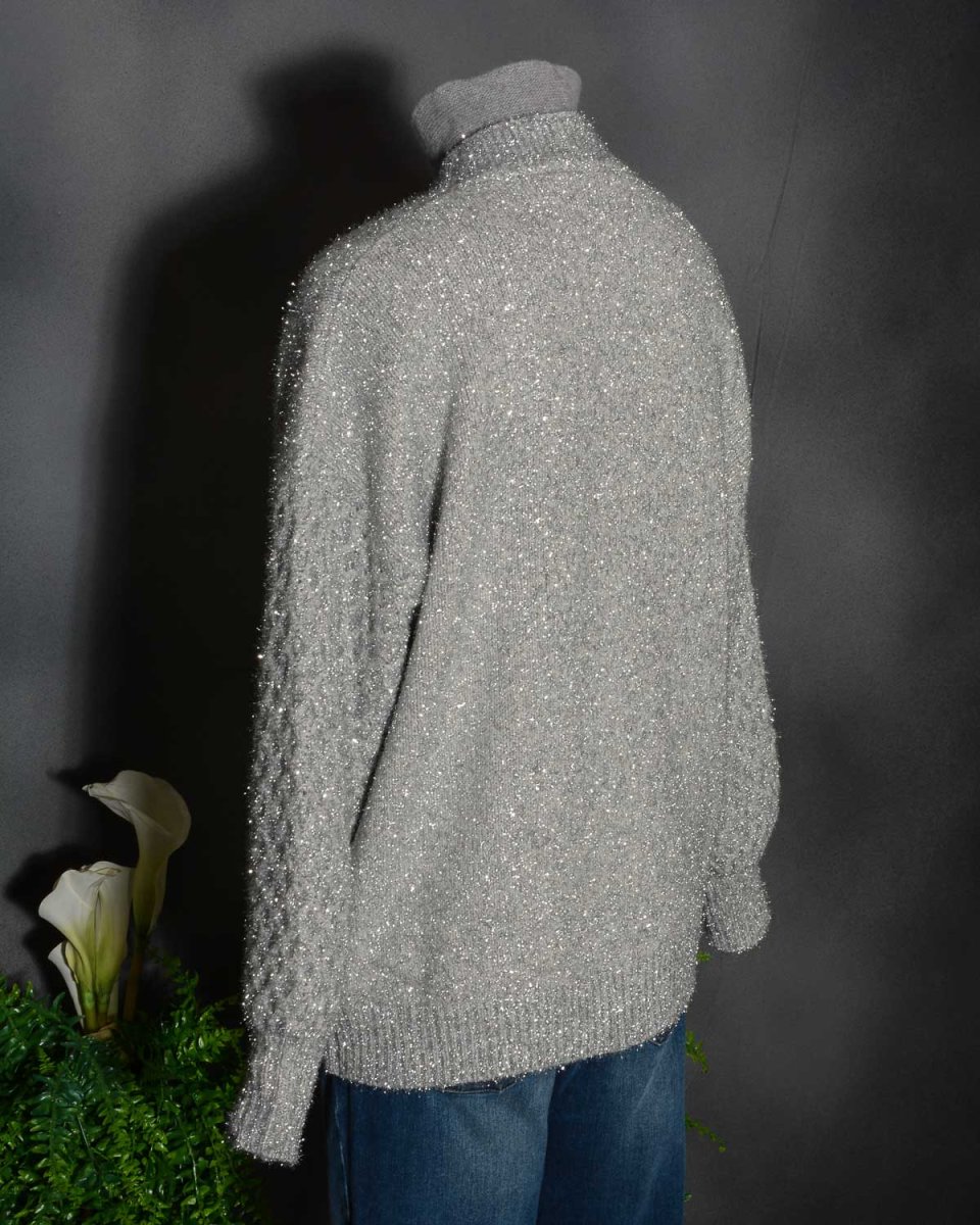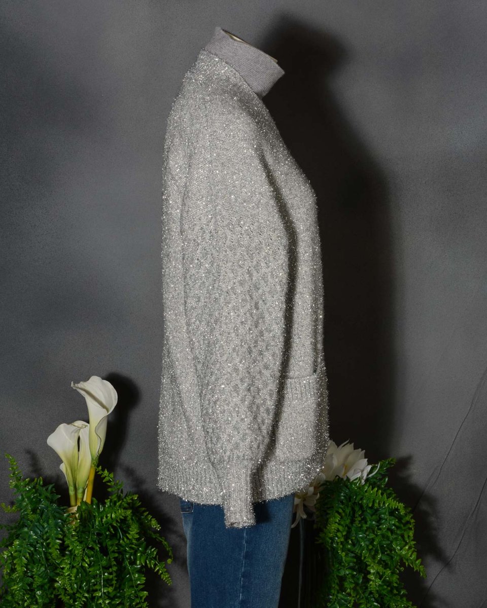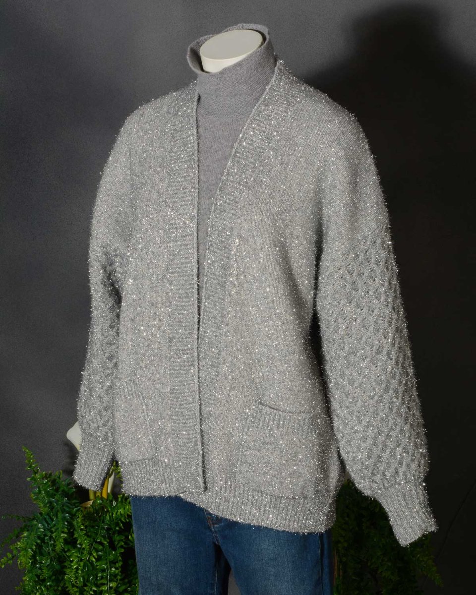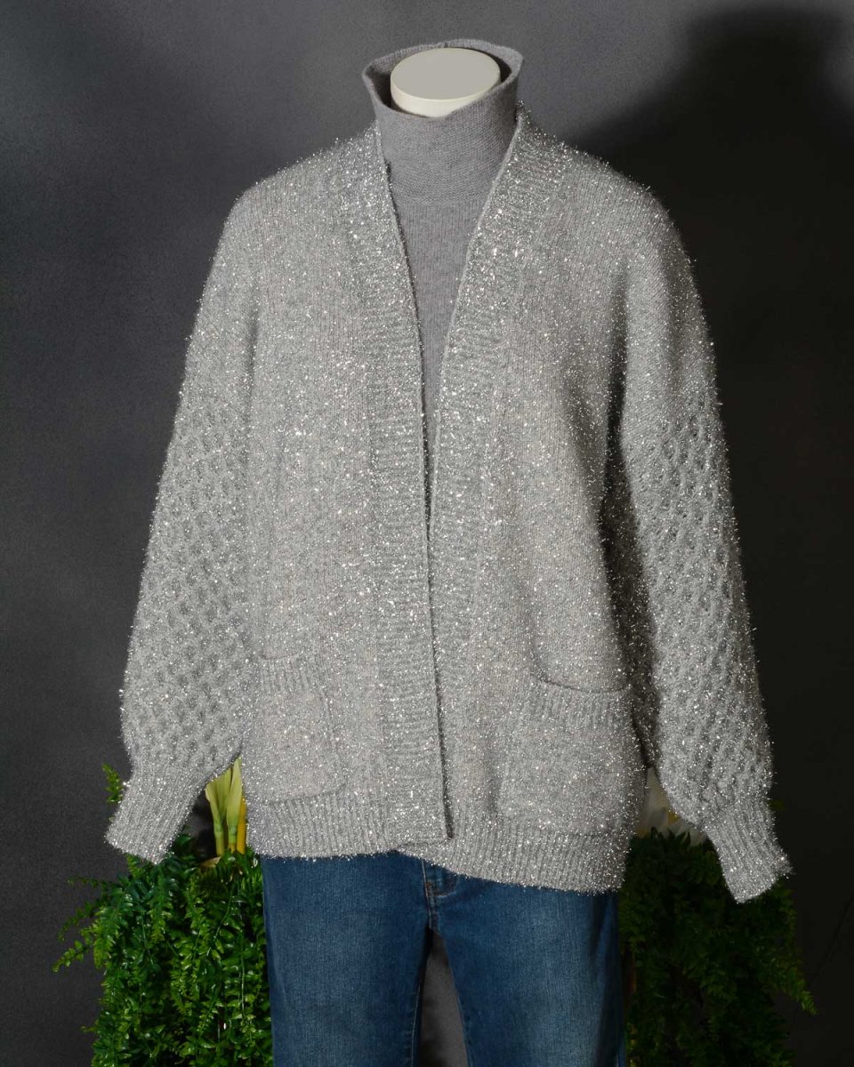 Shiny cardigan Roberto Collina D43210. Sorprendente nel design e nel materiale. Realizzato in cashmere e lana con un punto particolare in maglia, questo cardigan over è perfetto per farti splendere. Colore Argento con riflessi lucenti. Vestibilità comoda.