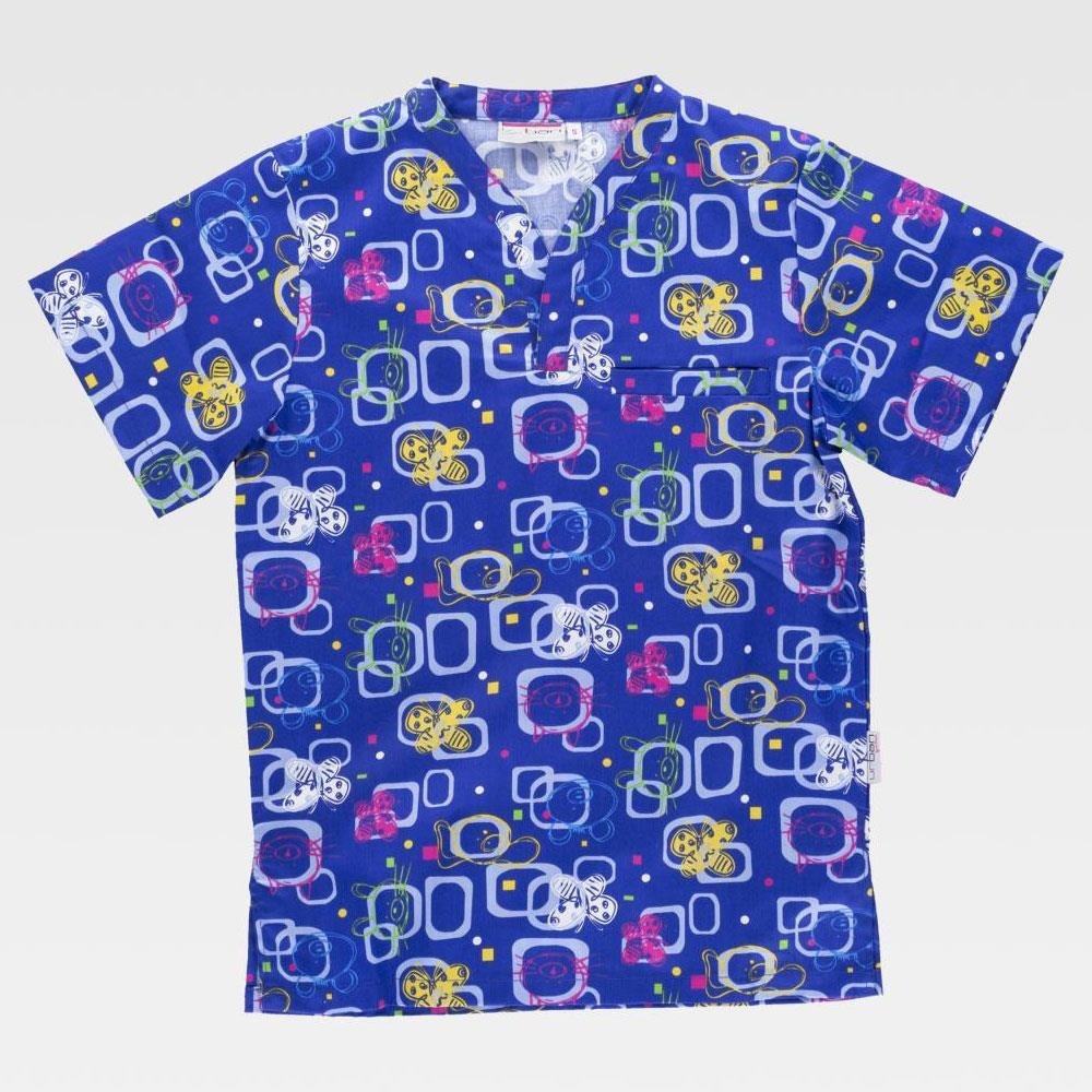 Casacca sanitaria a maniche corte di colore blu con disegni colorati, realizzata in poliestere/cotone con tessuto antimacchia, perfetta quindi per l’utilizzo nel settore sanitario e nel campo della ristorazione. La linea classica e gli spacchetti laterali conferiscono alla casacca B9802 un facile indosso ed una grande libertà di movimento per tutto il corso della giornata lavorativa. Disponibile dalla taglia S alla XXL, questa casacca medica è dotata di un