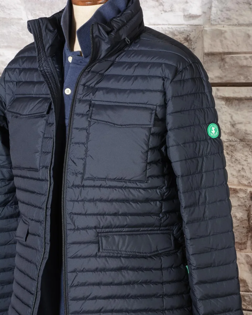 Field Jacket 4 tasche con pattina sul fronte, cappuccio a scomparsa con zip, trapuntatura orizzontale con imbottitura in Plumtech, chiusura centrale con zip, doppio bottone di regolazione sul polsino.