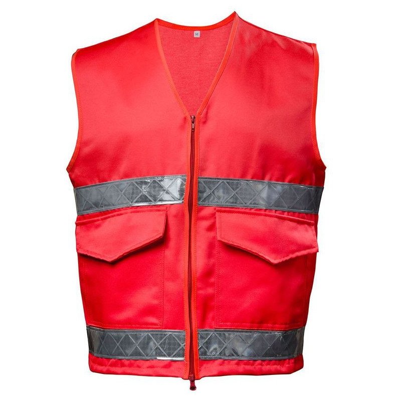 Gilet 118. Apertura frontale regolabile chiusura con velcro. 2 tasche in vita con patta. 2 bande Reflexite orizzontali in vita – Composizione: 20% cotone 80% poliestere. Peso 260 g/mq. Taglia unica (M-XXL). Colore: Rosso HV.