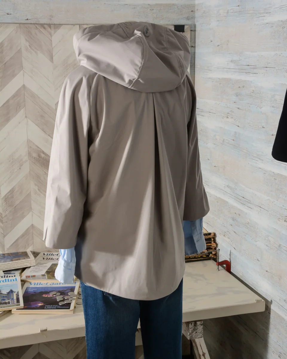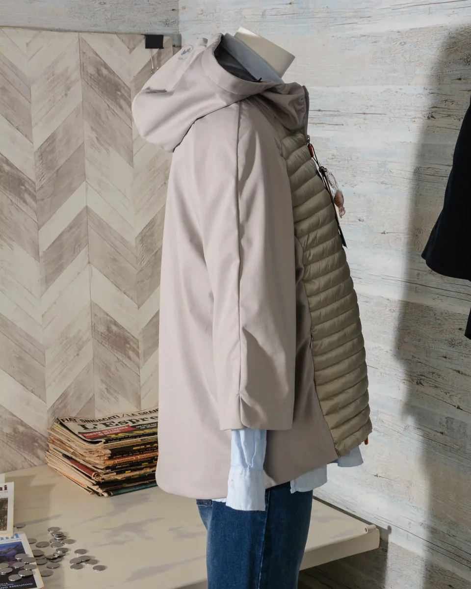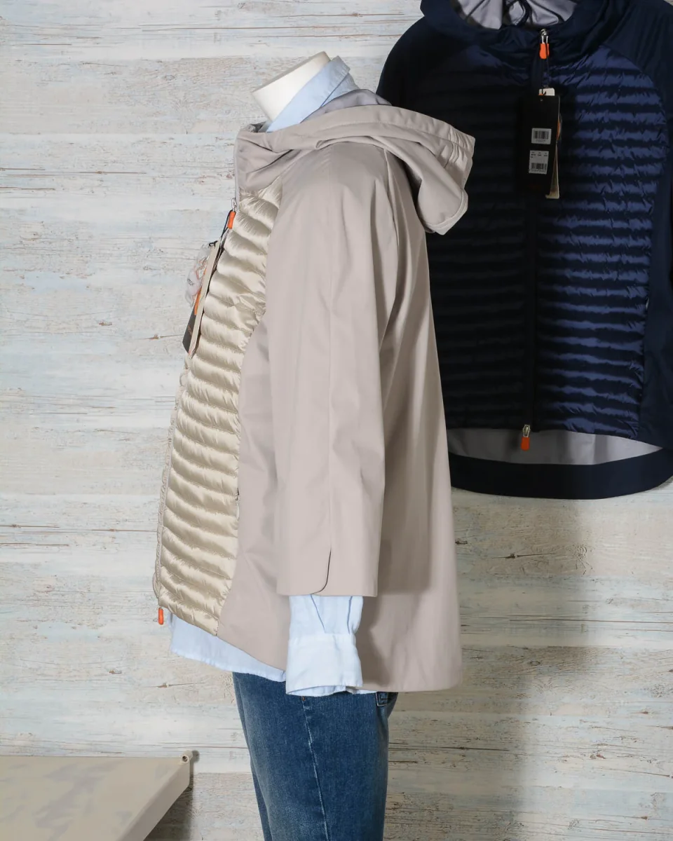 Giubbotto donna di Save The Duck in tessuto BAIS8 con sezioni lisce e sezioni con imbottitura e trapuntatura. Taglio regolare e leggero in stile giacca a vento, maniche 3/4, pannello frontale trapuntato e con leggera imbottittura, grande cappuccio fisso con logo stampato sul retro, chiusura centrale con zip.