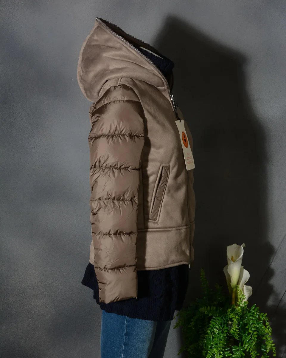 Giubbotto in ecopelle donna Save The Duck con maniche e retro in trapunta, colore marrone coffee brown, cappuccio fisso, tasche corpo in diagonale chiuse da automatico, logo tono su tono sulla spalla sinistra. Lavaggio ad Acqua.