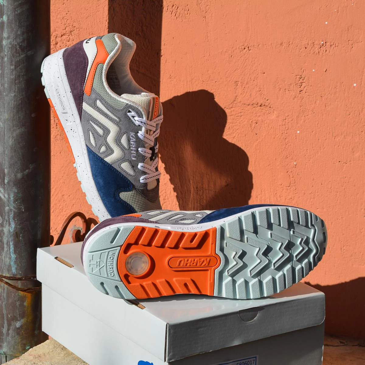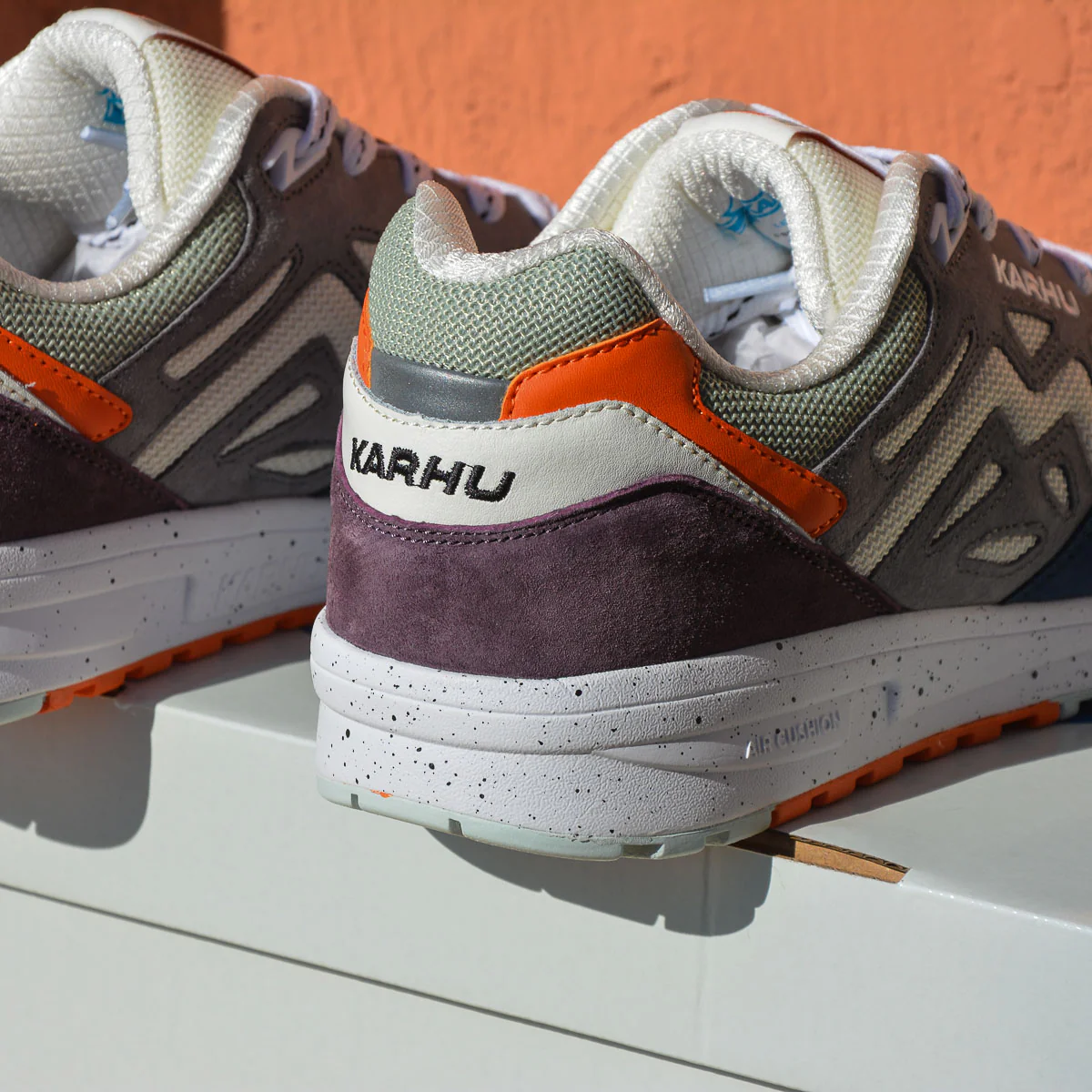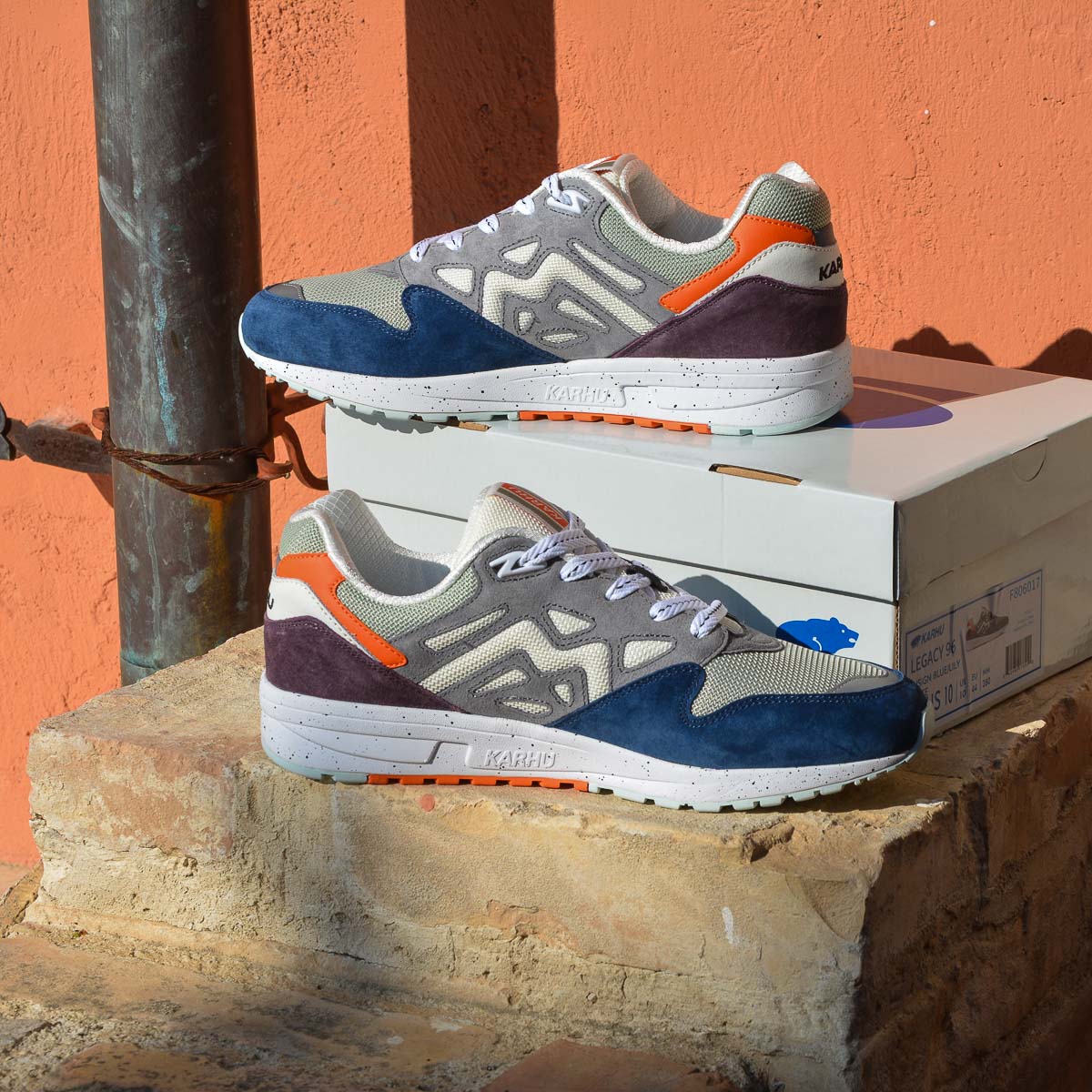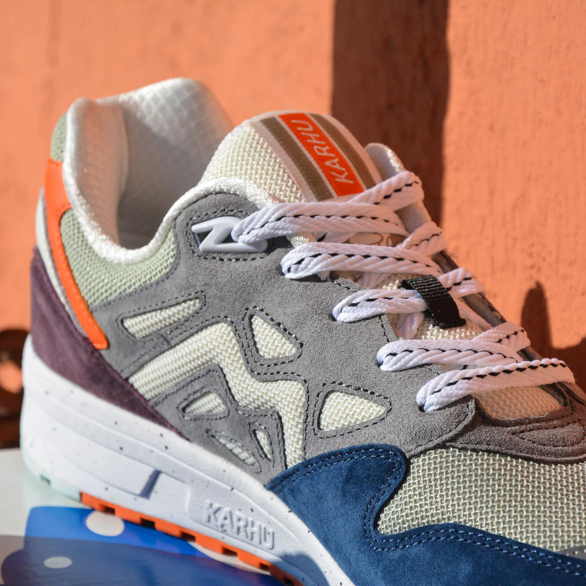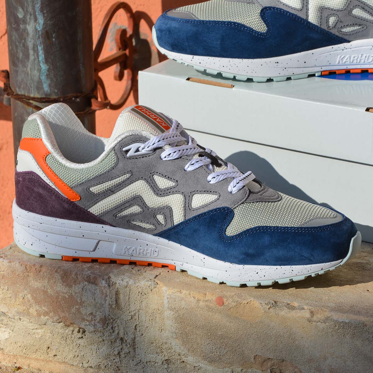 Le sovrapposizioni più scure in pelle scamosciata, insieme al mesh di colore più chiaro e al mix con colori pop più brillanti, danno al pack Karhu Legacy 96 un appeal outdoor e si adattano perfettamente ad un ambiente urbano.