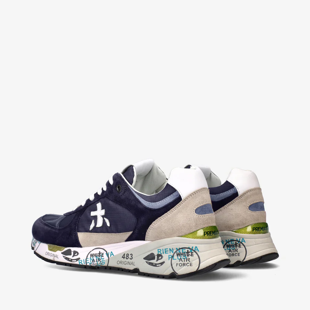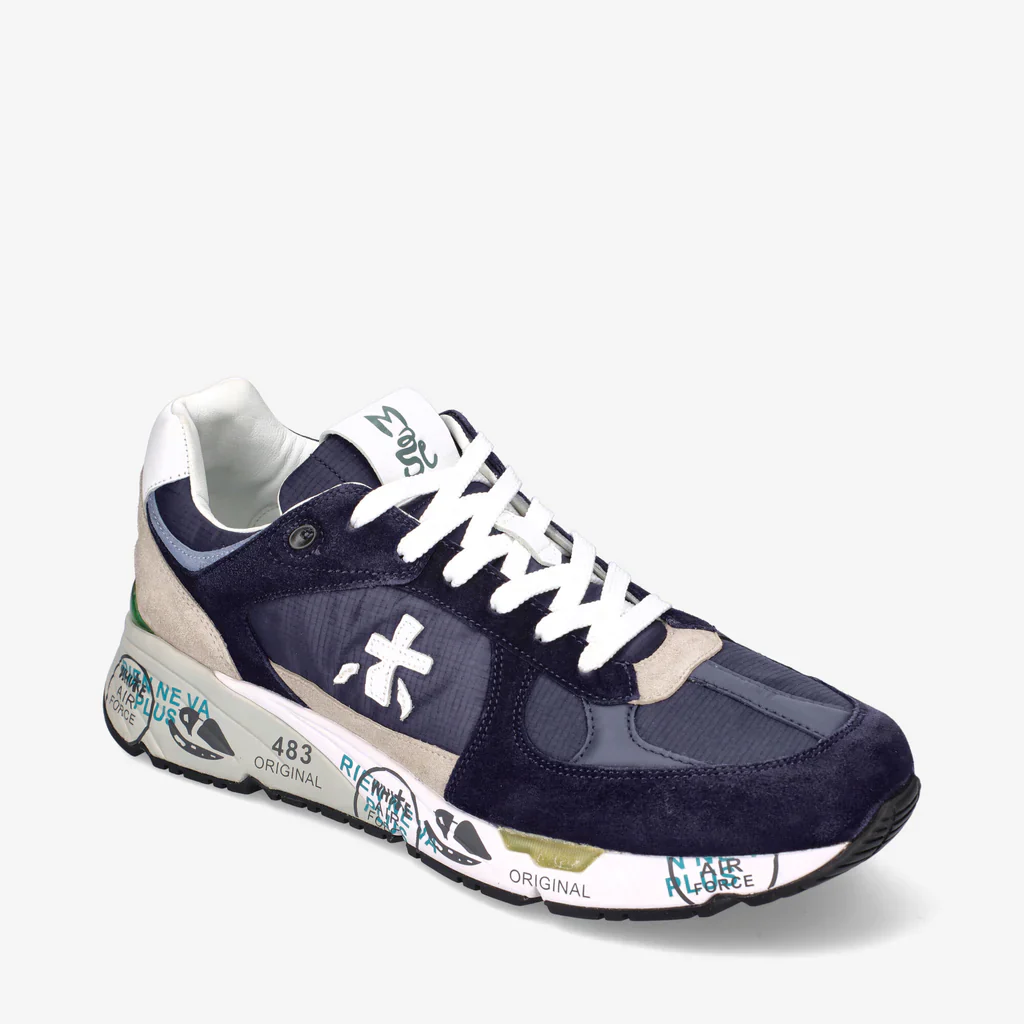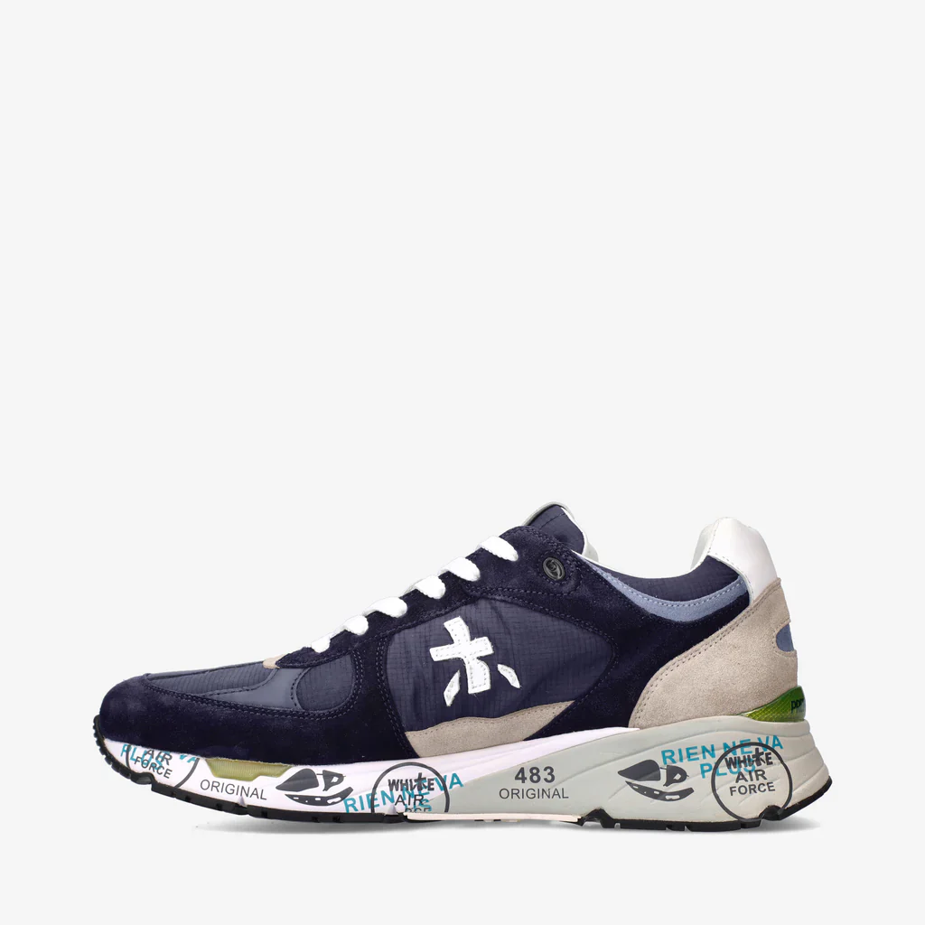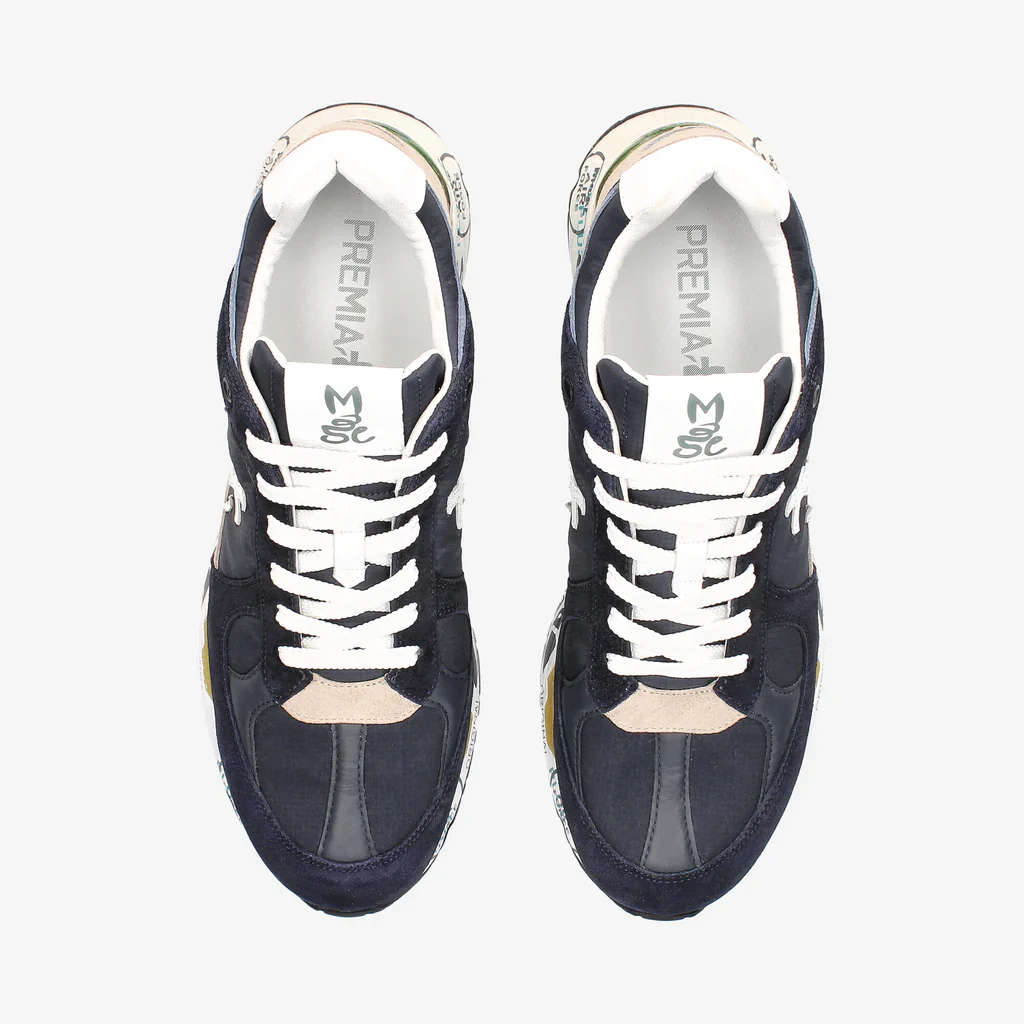 Sneaker uomo di Premiata modello MASE 5684 in nylon blu con inserti in suede tono su tono. Il look è arricchito dall’inconfondibile logo Premiata.