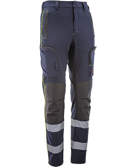 Pantalone tecnico dotato di due tasche cosciali chiuse da cerniera, due tasche anteriori e una tasca posteriore. Zona del ginocchio rinforzata con tessuto antiabrasione di colore nero testato per >250.000 sfregamenti. Fondo pantalone con sistema di ancoraggio alla calzatura con inserto in materiale anti scorrimento. Vita alta con elastico interno autoregolante e ampi passanti in cinta. Tessuto bielastico poliestere/elastan. Inserti in piping a contrasto. VESTIBILITA’ SLIM FIT