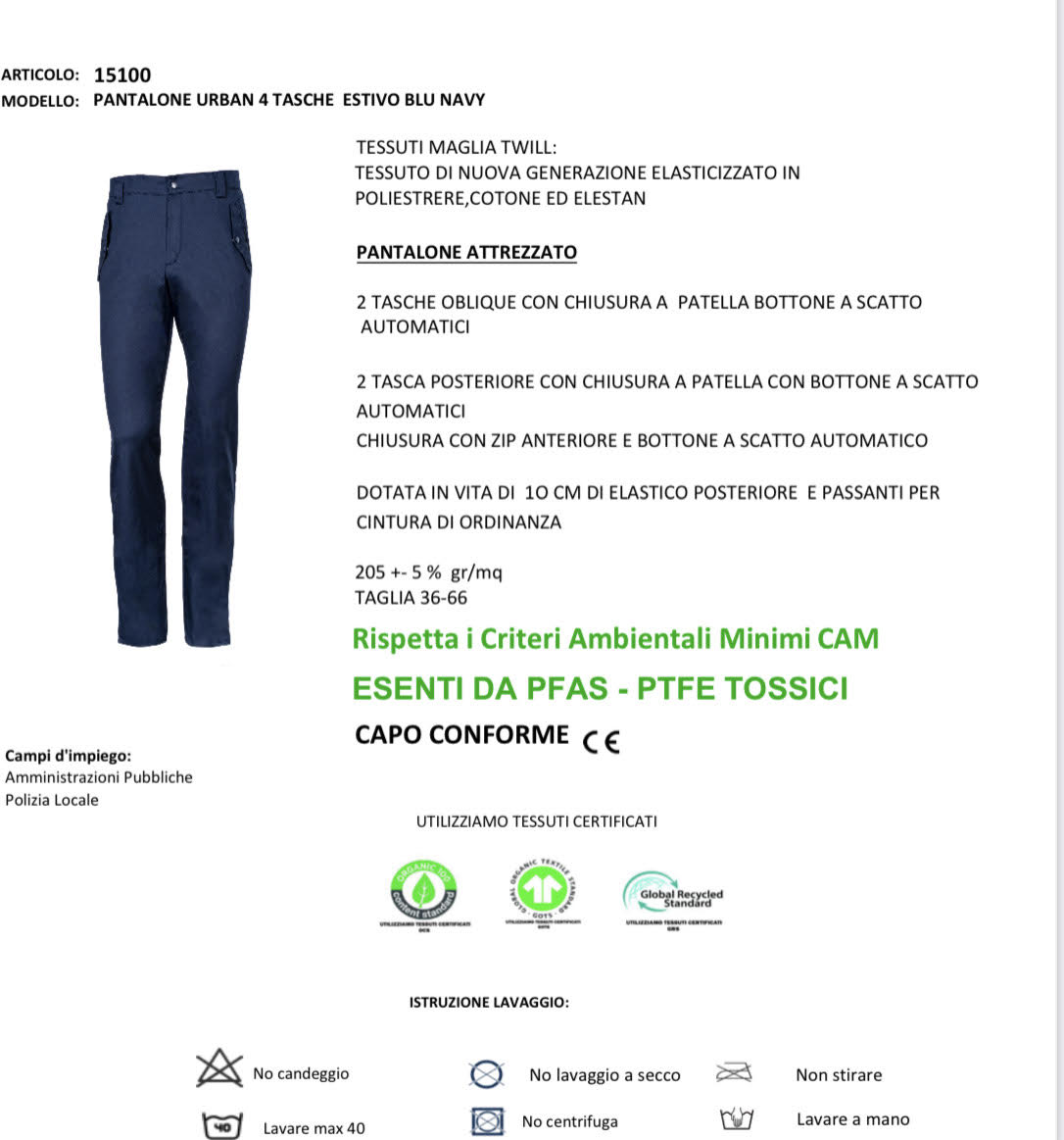 Dotato di 2 tasche oblique con chiusura a bottone automatico, 2 tasconi laterali e 2 tasche posteriori con chiusura a strappo, per una gestione pratica e sicura degli oggetti. Chiusura frontale con zip e bottone automatico, fascia elastica posteriore da 10 cm e passanti regolabili per cintura di ordinanza, per una vestibilità comoda e funzionale in ogni situazione.