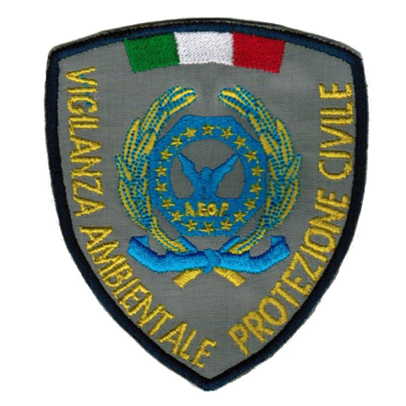 Scudetto ricamato AEOP Vigilanza Ambientale – Protezione Civile fondo grigio.