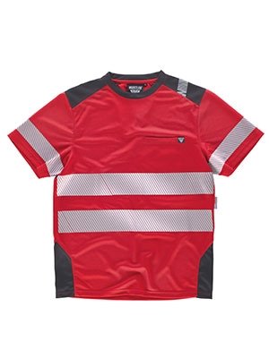 Tasca sul petto. Due bande cucite sul retro. Nastro decorativo personalizzato su una spalla. T-shirt manica corta combinata in poliestere “occhio di pernice” con bande riflettenti segmentate. Una banda termoadesiva riflettente segmentata sulle maniche e due di diverse dimensione sul petto.